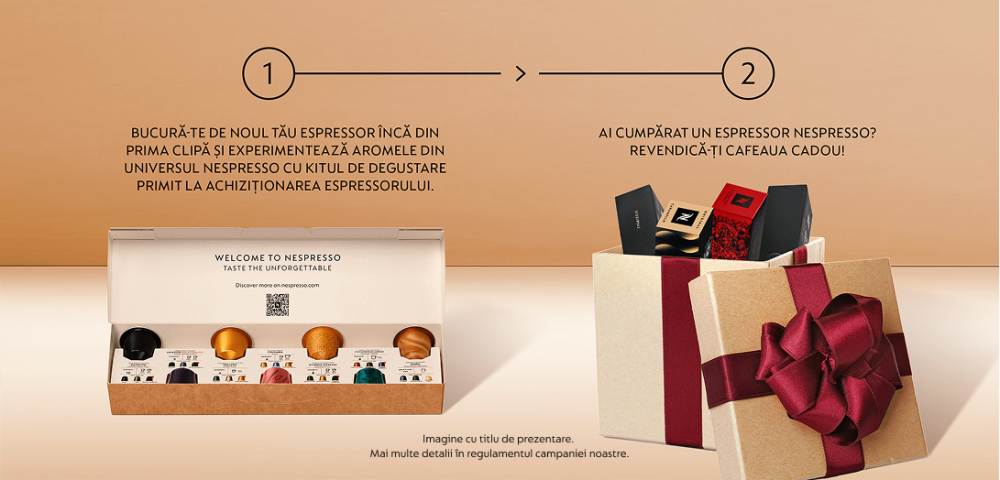 Voucher cafea de până la 150 lei la prima comandă. Cumpără un espressor participant la promoţie şi poți beneficia de un voucher cadou de până la 150 lei pentru achiziţionarea capsulelor de cafea. Mai multe detalii în regulament -> vezi detalii.