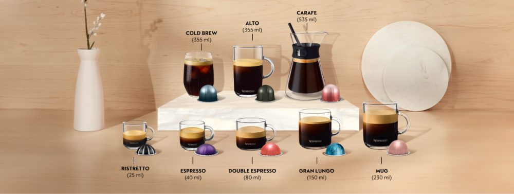 Double Espresso (80 ml), Gran Lungo (150 ml), Mug (230 ml), Alto/ Cold Brew (355 ml) și Carafe (535 ml). Aromele bogate,