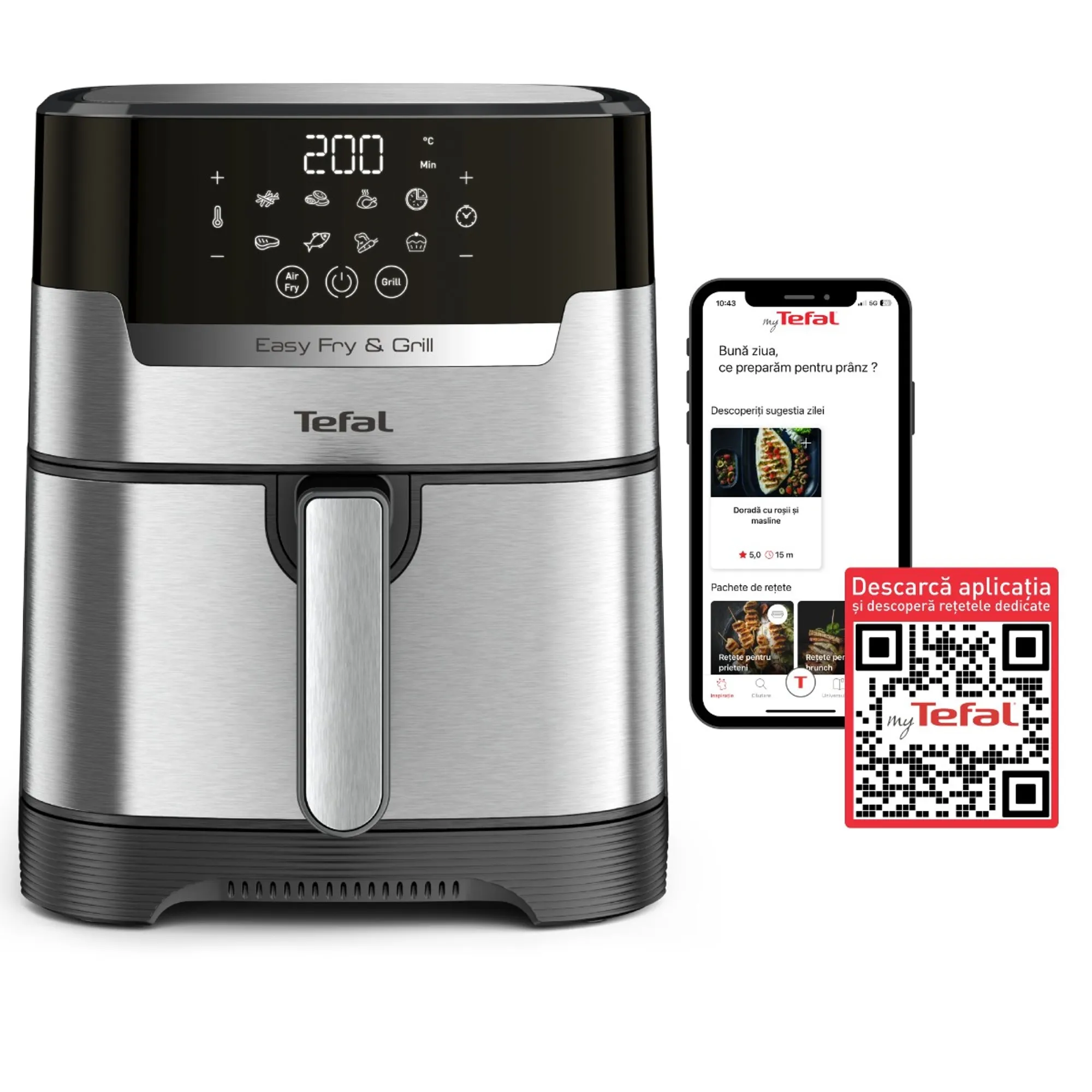- 8 programe automate: cartofi prajiti, nuggets, pui prajit, pizza, carne, peste, legume, desert. In plus, poti prepara gustari delicioase folosind functia de deshidratare, gratar delicios si suculent folosind accesoriul dedicat.