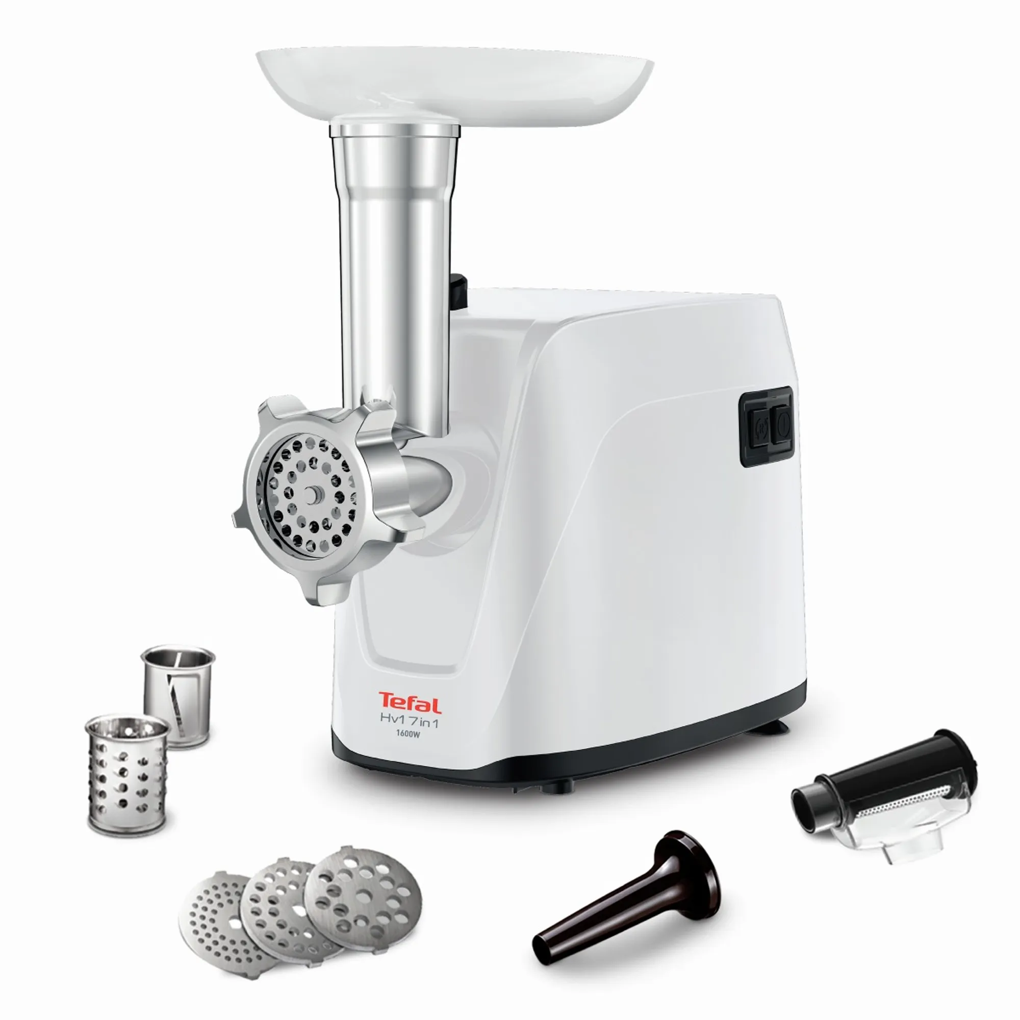 Masina de tocat carne Tefal HV1 NE114130, 1600 W, 1.9 kg carne/min, 3 site pentru tocare fina, medie si grosiera, accesorii pentru razuire, feliere, carnati si sos de rosii, baza aderenta, alb
